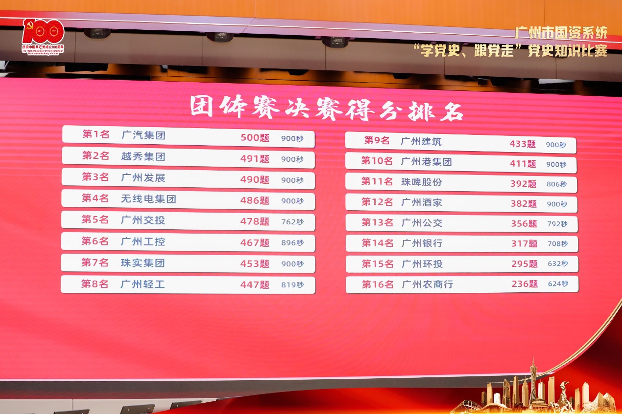 在团体赛决赛中,参赛选手你追我赶、高潮迭起,越秀集团代表队选手快速适应比赛节奏,及时调整战略,敢于争先,奋力拼搏,生动展现出越秀人“不断超越、更加优秀”的精神风貌,其中来自越秀地产的张学平表现出色,比分持续领先,拿下个人答对200题的高分,赢得了现场观众的阵阵喝彩和热烈掌声,为观众呈现了一场精彩的党史知识大比拼,最终越秀集团代表队答对491题夺得团体赛第二名,与广汽集团一并荣获团体赛特等奖。