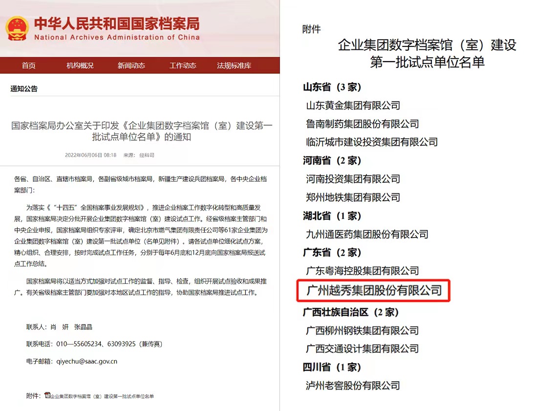 国家档案日来临之际,6月6日,国家档案局公布了企业集团数字档案馆(室)建设第一批试点单位名单,越秀集团成功入选,成为首家获此殊荣的广州市属国有企业。